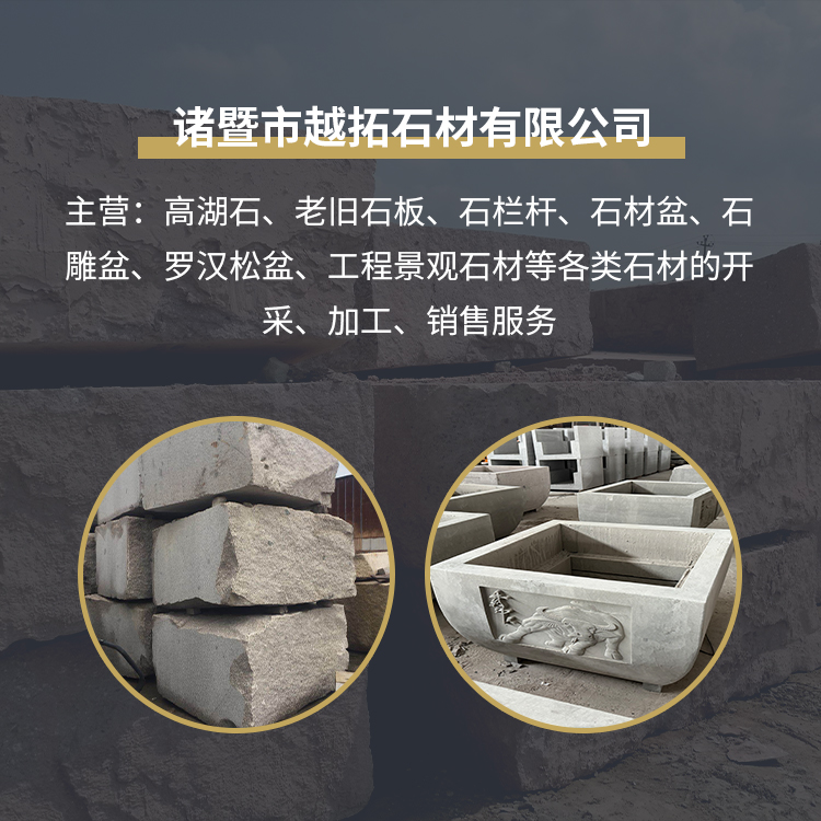 越拓石材专业从事高湖石、老旧石板、石栏杆、石头盆、石材盆、石雕盆、大型盆景盆、罗汉松盆、工程景观石材等各类石材的开采、加工、销售等已有三十多年,产品种类齐全,价格实惠,满足不同需求的客户。